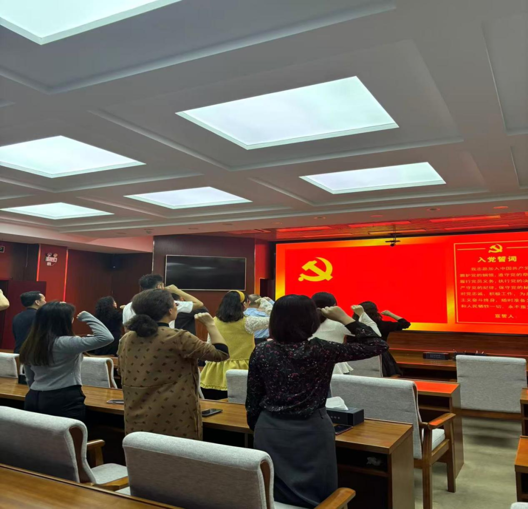活动在庄严的国歌声中拉开序幕,全体参会人员肃立,共同奏唱国歌,表达对祖国的无限热爱和崇高敬意。随后,大家重温入党誓词,铿锵有力的誓言在会议室回荡,彰显了党员们不忘初心、牢记使命的坚定信念。